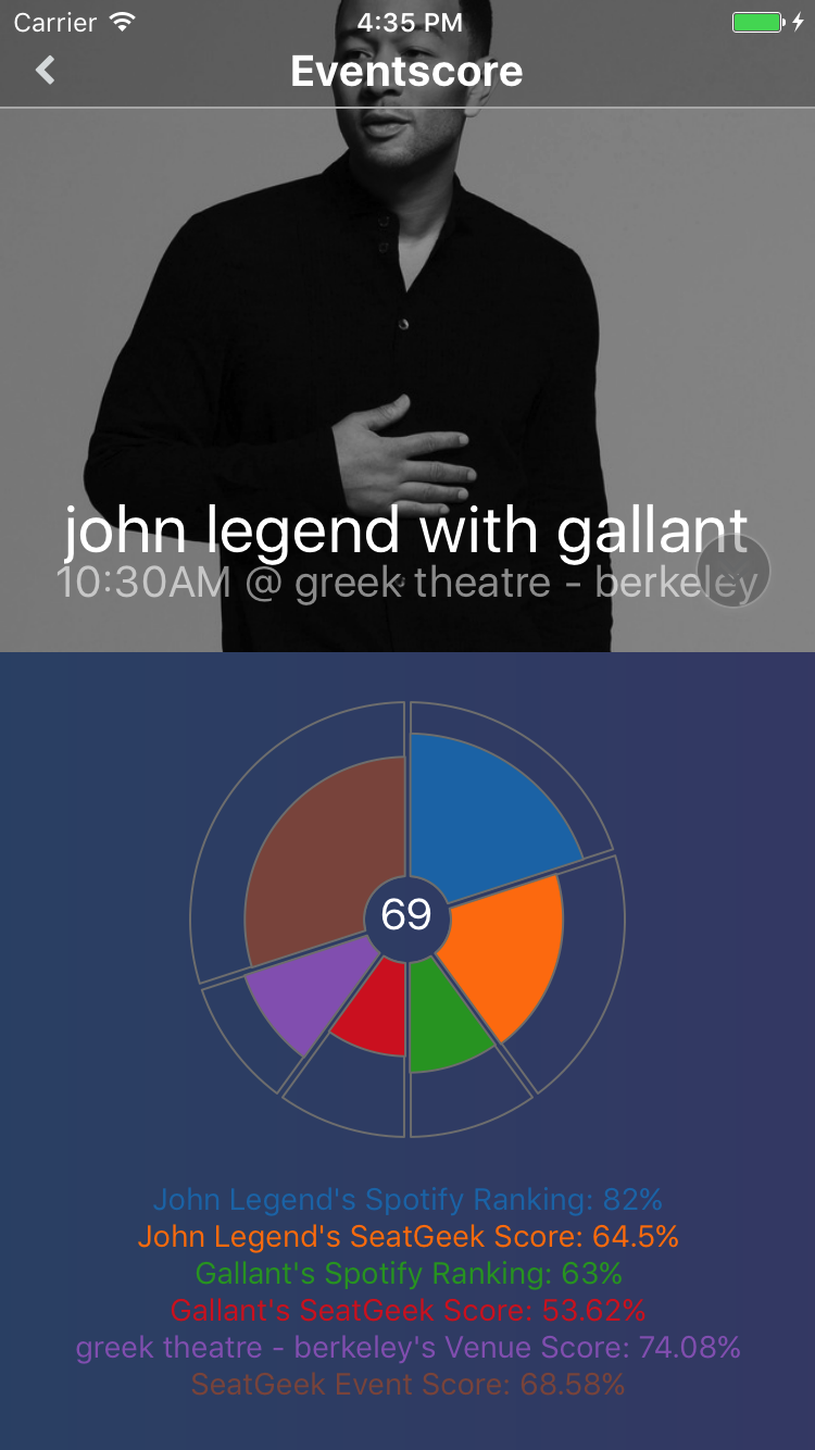 Our app curates a list of upcoming concerts given your search query and scores the event based on an algorithm that concatenates various scores from 3rd Party API services (Spotify, Klout, SeatGeek, and etc) as well as social tones from social media sources to one. The application utilizes microservices to serve fetched social tones for each particular event based on a timed job schedule.